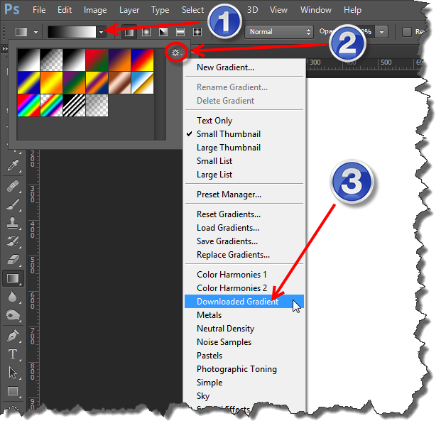 Now in the option panel click on the drop down menu which is marked with “1” in the below image. Then click on the “gear” icon which is marked with “2” and then select your newly downloaded gradient.