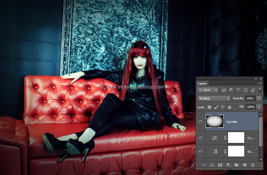 Change the blend mode of vignette layer to Multiply and reduce the opacity to 69%. Press Ctrl+D/Cmd+D to deselect the selection.