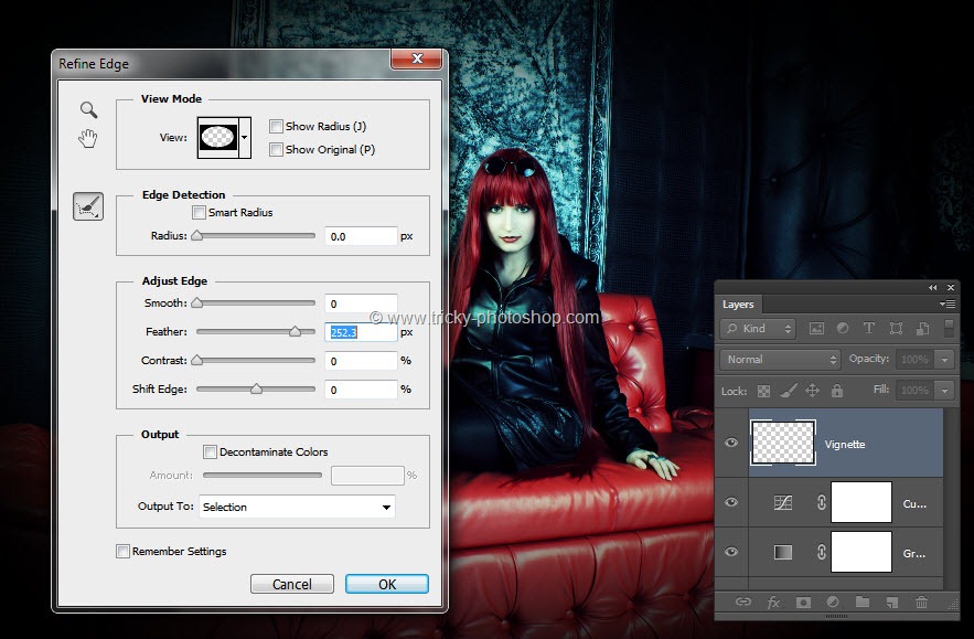 Go to Select>Refine Edge and increase the feather to 250 pixels. Value of feather depends on the dimension of the image. If your image have large dimension than you may require high amount of feather and vice versa. Press OK. Press Ctrl+Shift+I/Cmd+Shift+I to invert the selection.